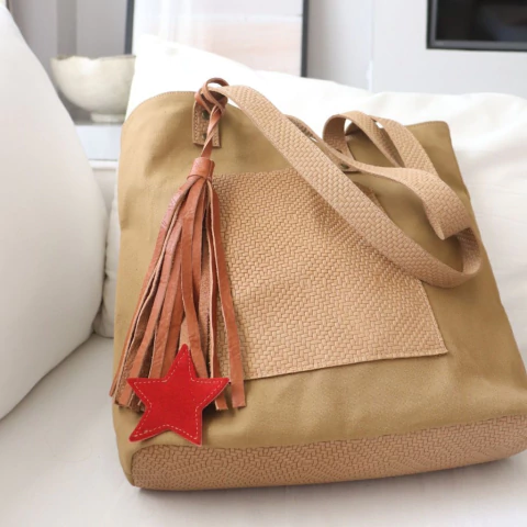 Cuero beige trenzado en manijas, base y bolsillo exterior